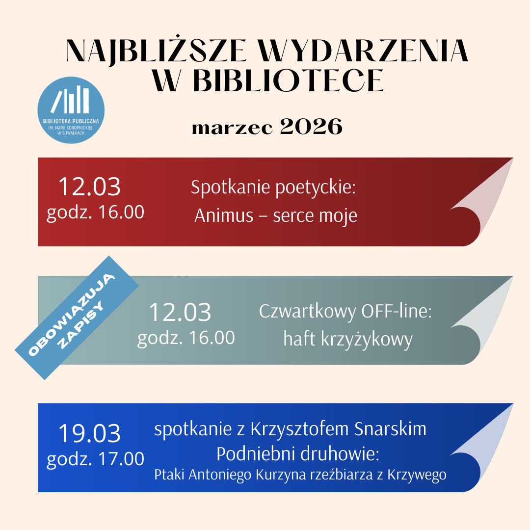🧵 𝟏𝟐.𝟎𝟑 | 𝐠𝐨𝐝𝐳. 𝟏𝟔:𝟎𝟎 Czwartkowy OFF-LINE – haft krzyżykowy: dwie grupy – dla młodzieży i dla dorosłych! / obowiązują zapisy w Wypożyczalni dla Dzieci lub pod numerem telefonu: 87 565 62 46 wewn. 17